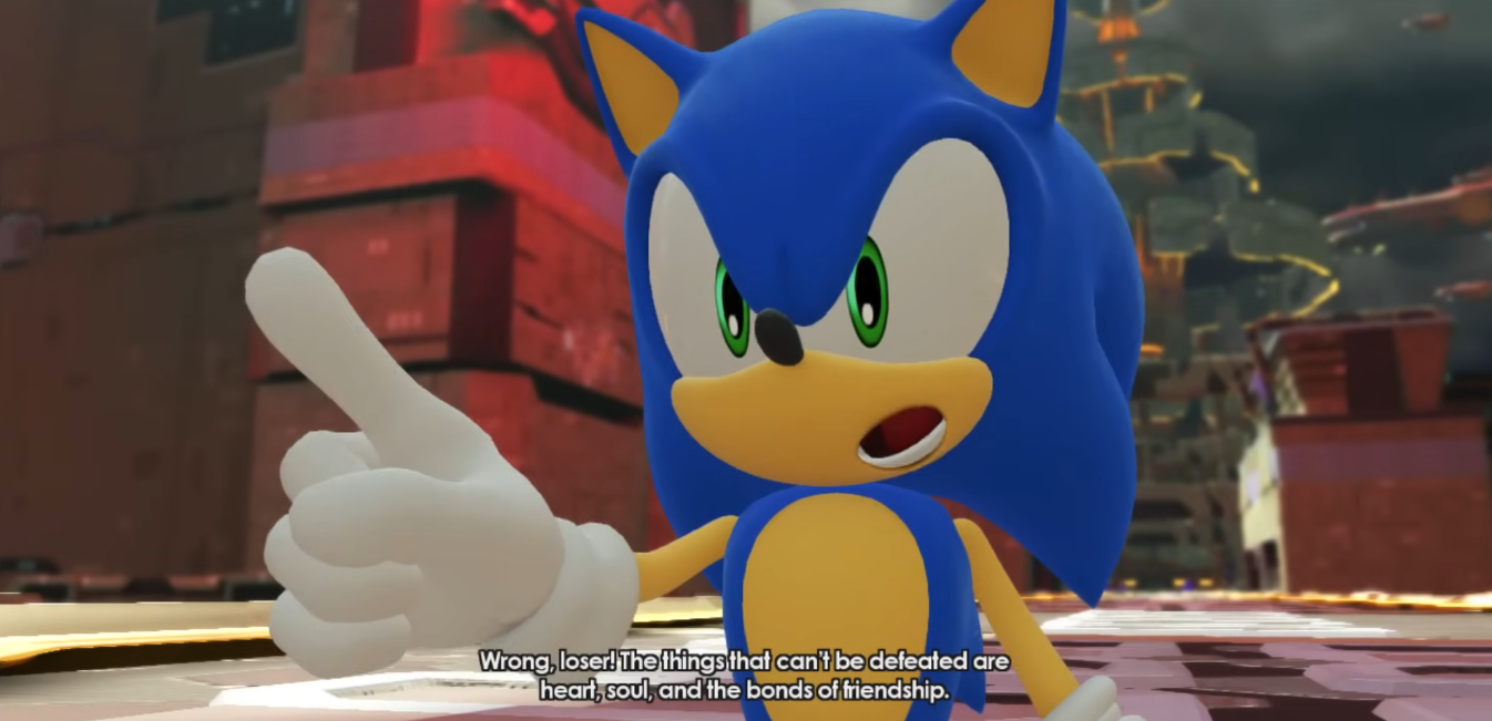 Still, what the interview musing encapsulates is that, even in the base game, Infinite and his theme song were always meant to depict a character obsessed with strength, but simultaneously framed as obtaining a “false strength” set to be highlighted by poetic irony in the end. This also parallels the main heroes of the story in this ultimate final battle, as while this isn’t easily seen from the game’s narrative text, it’s reasonable to assume that his blusterous and ultimately hollow strength coming undone due to Sonic and the Avatar’s bond of friendship and trust is an intentional reason his character ended up this way, as a narrative foil to the Avatar’s character arc. As Infinite constantly rambles on about weakness in relying on others, and the value of his own strength lifting himself above everyone else, he mirrors and antagonizes the journey of the Avatar. Initially they lack confidence in themselves, but eventually do find strength in those around them, ending with the encouragement from Sonic enabling them to overcome their doubts and Infinite himself.
