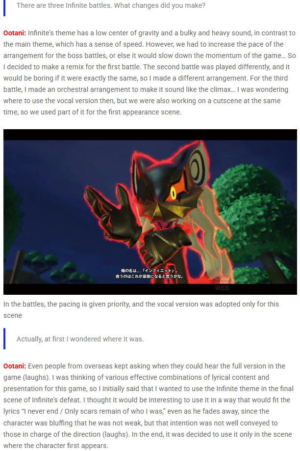 To start with, an interview with Tomoya Ohtani illustrates one of the more confusing aspects of Forces’ final release, that being why Infinite’s lyrical theme isn’t located anywhere in the final game. This interview was published on Nintendo Dream Web on 11 November 2018, to commemorate the release of the Sonic Forces Official Soundtrack. During the interview, Ohtani laments that they weren’t able to incorporate the main lyrical theme for infinite in the final battle, as he felt like Infinite’s boasts of superiority in the song properly embodied Infinite bluffing that he was not weak, and Infinite’s eventual fading away in this scene in the face of Sonic and the Avatar’s teamwork would have been an appropriate combination of lyrical storytelling and presentation in the game. The reasons for why this was not accomplished relates to the creation of the theme song absent of a set place in the final product, and Ohtani muses that his eventual intention may not have been properly conveyed.